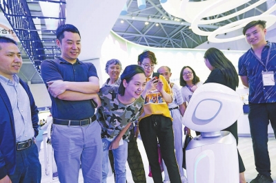 参观人员与智能机器人互动交流