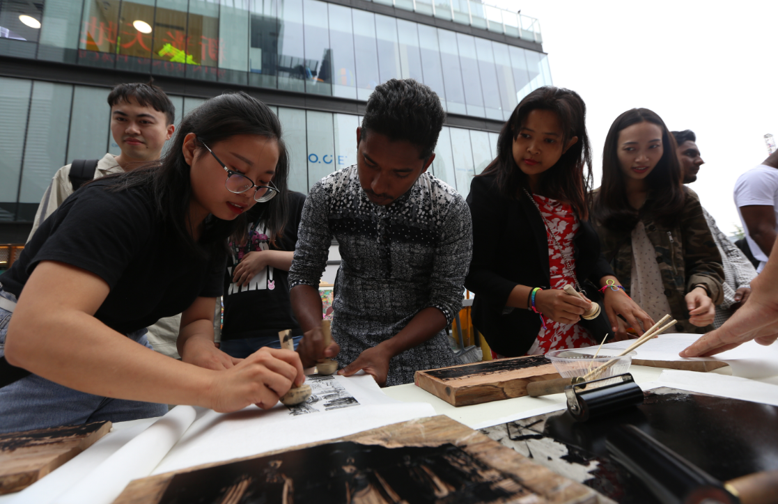 此外,活动主办方还联合四川美术学院进行了《版画绘重庆》艺术创作,通过版画艺术绘制出一幅展示重庆美景的5米长卷。作品里的重庆让人流连。看到这么多美图,现场不少外籍友人也跃跃欲试,拿起工具要画一幅重庆的美图。