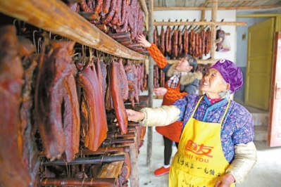 如今,曹长模更是带动全家来做腊肉。自己负责采购食材和前期基础工作,妻子龚学会负责熏制,30多岁的儿子则负责灌香肠。“现在我已经把熏制腊肉的手艺传给了儿子,希望我的子孙后代也一代一代做下去。”