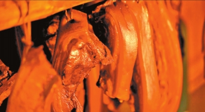 对于腊肉的制作,曹长模依旧采用老一辈的方法,没有半点偷工减料。首先,他坚持把好肉质源头关,精心挑选用粮食喂养的土猪肉,选好肉后,他要花一天的时间把切好的猪肉风干,再下刀切块至肥瘦适宜,然后用酒洗净去腥,涂抹腌制酱料。接下来,就是腌制了,曹长模会用瓦缸来腌制,铺一层鲜肉撒一层花椒和生姜,叠在瓦缸里放上四天四夜,其中还要隔两天翻动一次。最后,把腌好的肉取出,分别用热水、温水、冷水清洗三遍,待水滴净后再上炕熏制四天四夜。
