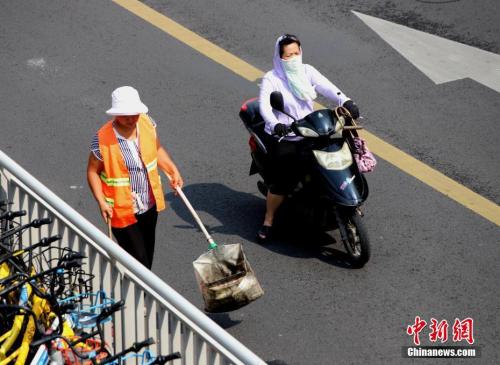 7月17日,河南郑州热浪滚滚,高温下工作的环卫工人。中新社记者王中举 摄