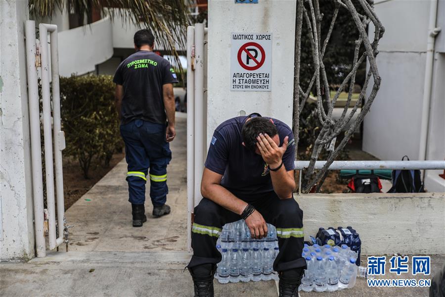7月24日,在希腊首都雅典附近的马蒂小镇,消防员稍作休息。新华社发(莱夫特里斯·帕察里斯 摄)