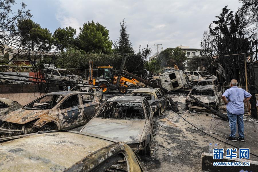 7月24日,在希腊首都雅典附近的马蒂小镇,一名男子查看焚毁的汽车。新华社发(莱夫特里斯·帕察里斯 摄)
