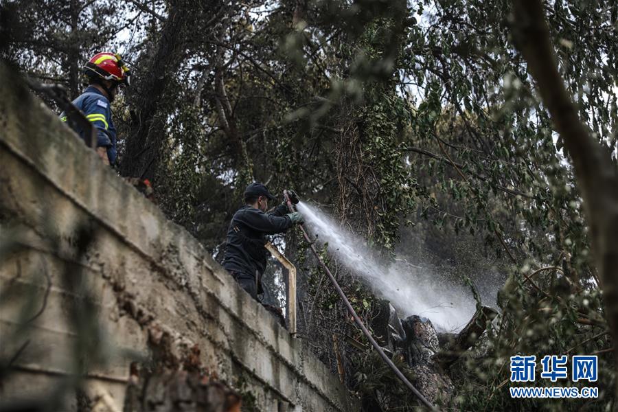 7月24日,消防员在希腊首都雅典附近的马蒂小镇扑灭零星明火。新华社发(莱夫特里斯·帕察里斯 摄)
